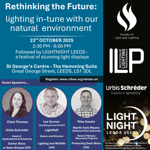 Book NowCome and spend the afternoon on this joint ILP and SLL event with 3 guest speakers covering topics including ‘Dark Skies or Safer streets’ and ‘Lighting and Wildlife’. Following the presentations we will have a bite to eat and then venture out to the option to walk around some of the fantastic art installation at Light Night Leeds.