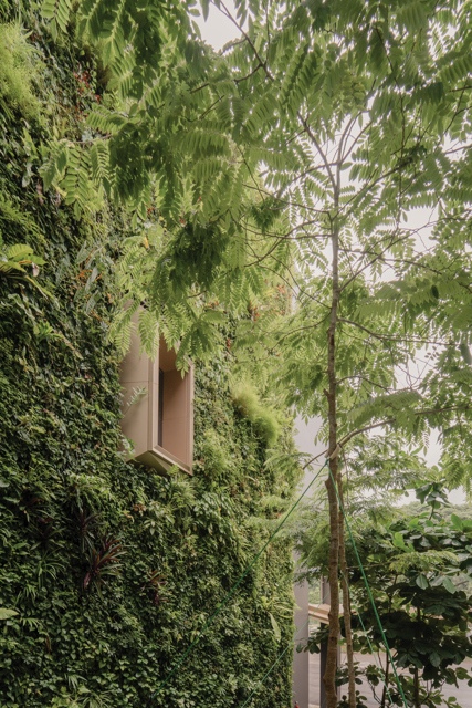 Figure 5: A meeting room portal peers out of the equatorial foliage and green wall to the entry drop off beyond. (Photo: Ong Chan Hao)